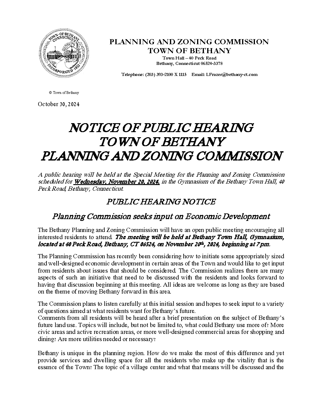 10/31/2024 - Notice of Public Hearing - Planning & Zoning 11/20/2024