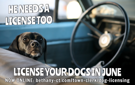 Photos wanted of all pets, animals, and critters in Bethany to be featured in the lobby of Town Hall in June for Dog Licensing Month!  Bring in or mail a printed picture of your pets to the Town Clerk's Office this month when you license your dog to show off to the whole town on our bulletin board!  (pictures will not be returned)
